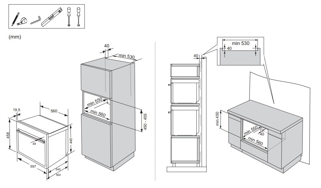 - Размер ниши (ВхШхГ): 450x560x550 мм
