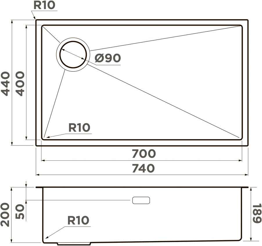 - Радиус скругления мойки: 10 мм
