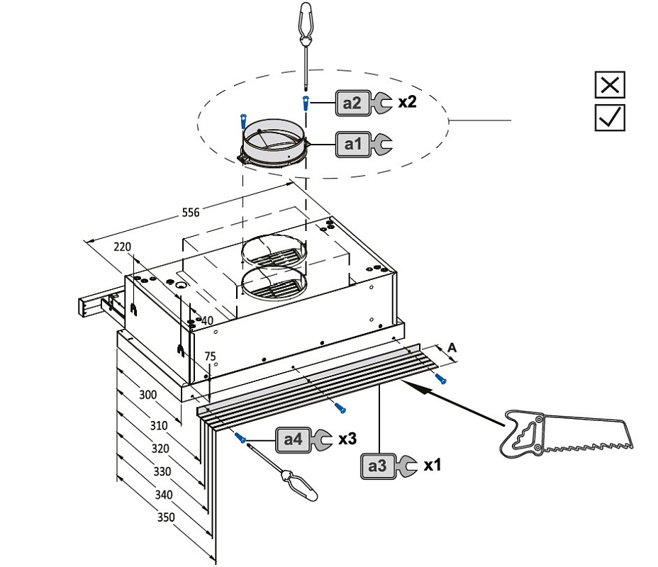 | Размеры вытяжки (ВхШхГ) | 221.5х600х300 мм |