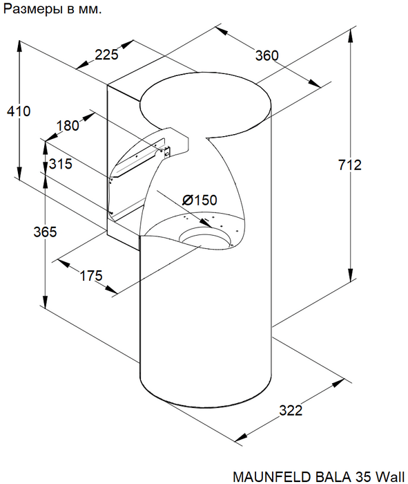 | Размеры вытяжки (ВхШхГ) | 712х322х360 мм |