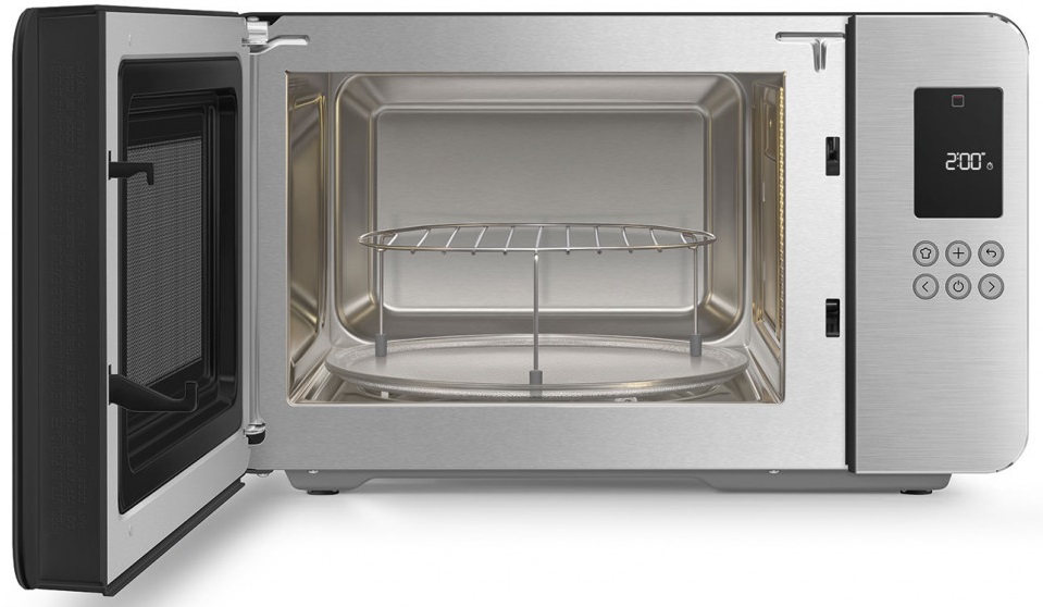 - 4 режима работы: Микроволновка, гриль, поддержание тепла и разморозка — с возможностью ручной или автоматической настройки в зависимости от блюда
