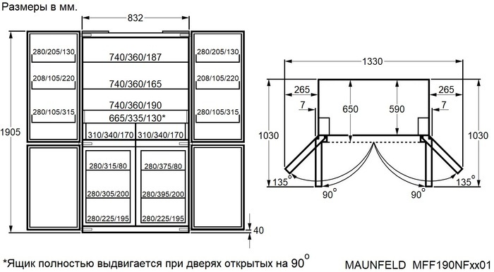 - Количество ящиков в морозильной камере (включая правую и левую камеры прибора): 4 ящика + 2 открытых контейнера