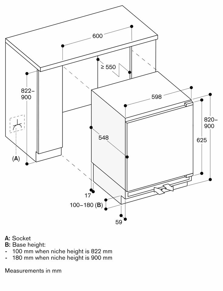 - Размеры ниши (ВхШхГ): 900-822х600х550 мм