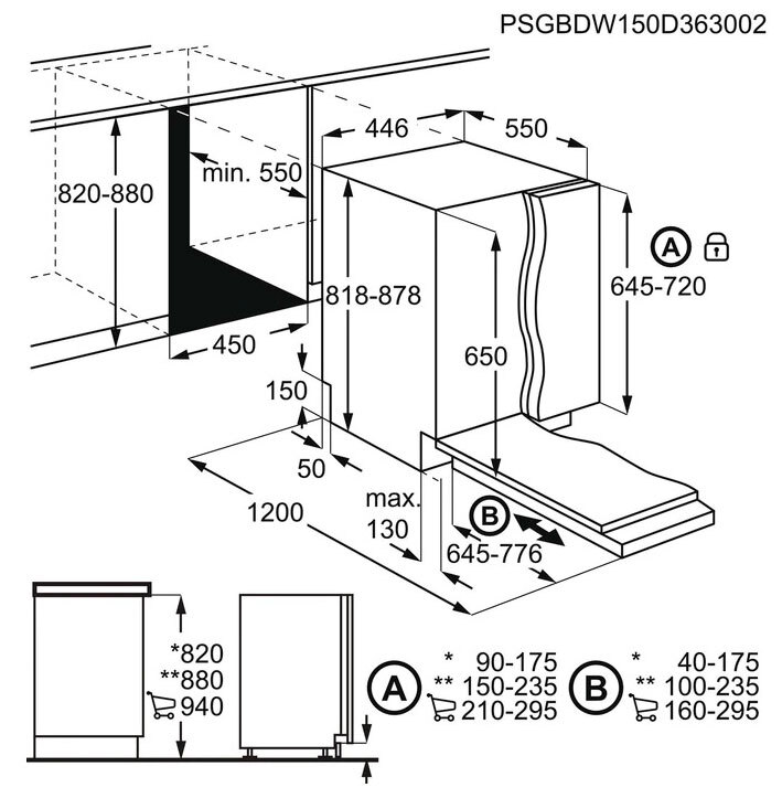 - Размеры ниши для встраивания (ВхШхГ): 820-880x450x550 мм