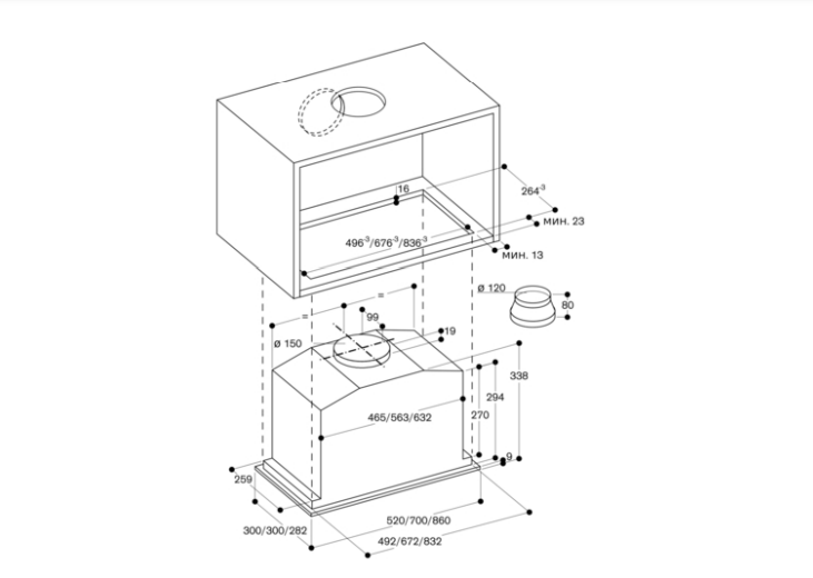 | Размеры вытяжки (ВхШхГ) | 338х860х282 мм |