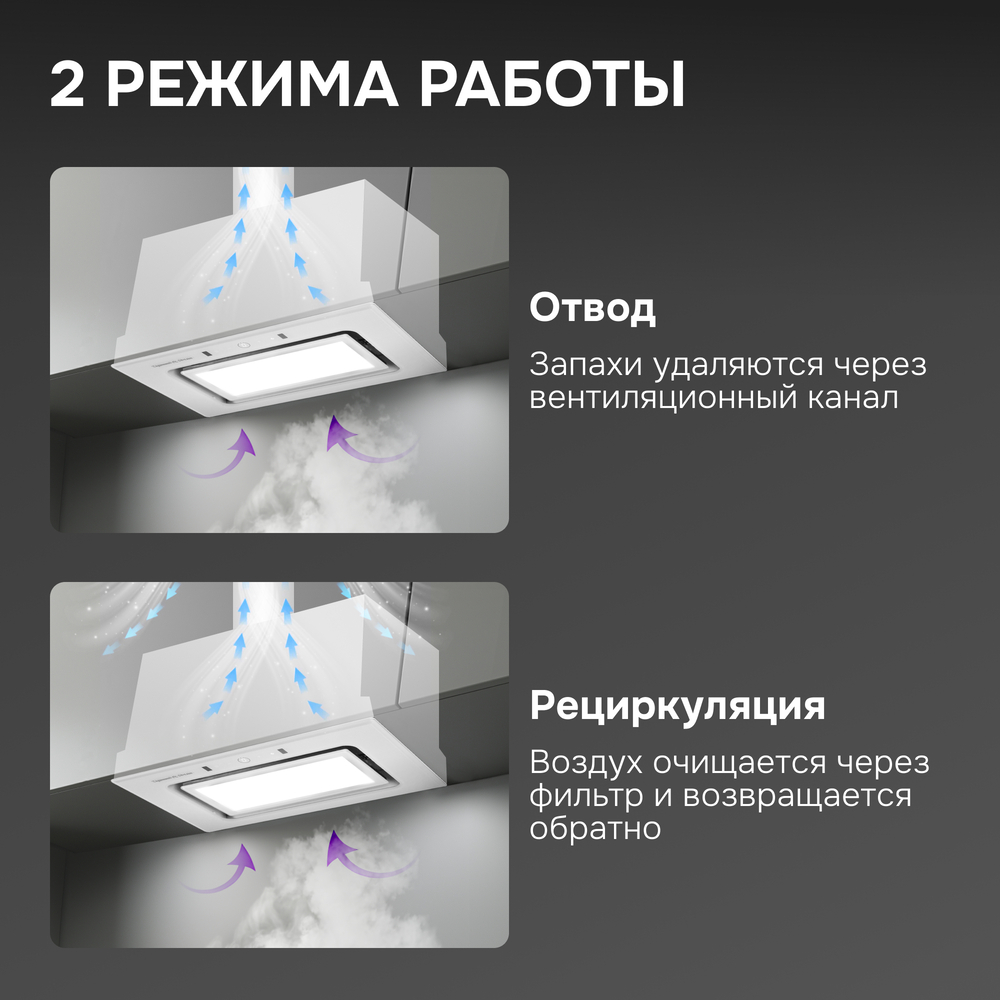 - Режим работы: Отвод/рециркуляция
